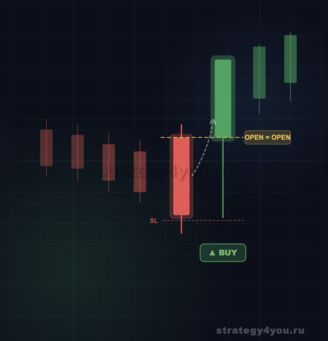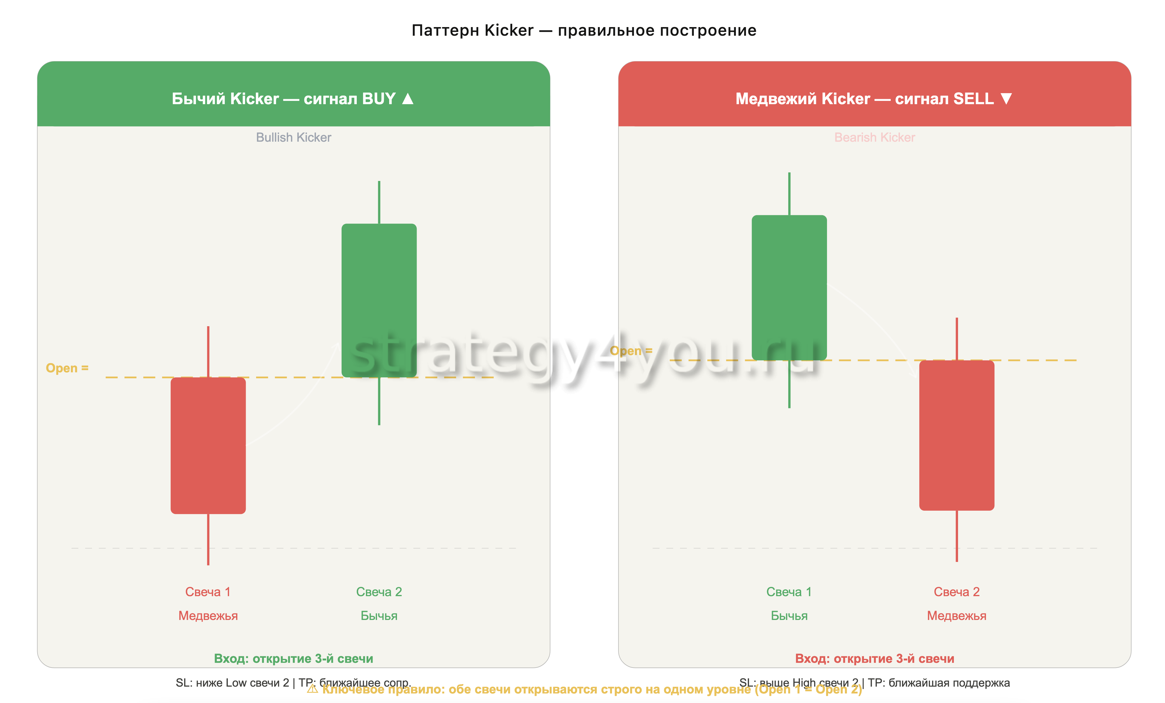В идеальном, эталонном паттерне «Кикер», цена открытия второй свечи должна быть РАВНА цене открытия первой (Open 1 = Open 2). Это ключевая фишка самого сильного варианта этого паттерна.