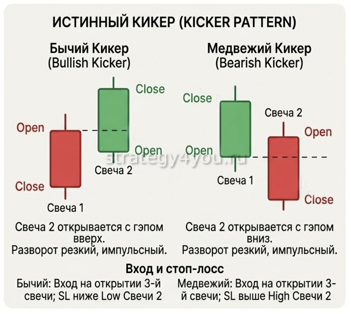 2) Смещение в сторону усиления (гэп еще больше): Если, например, для бычьего Кикера вторая зеленая свеча открывается выше цены открытия первой красной — это нормально! Это делает сигнал еще сильнее. Рынок не просто отыграл позиции, он с разбегу перепрыгнул их.