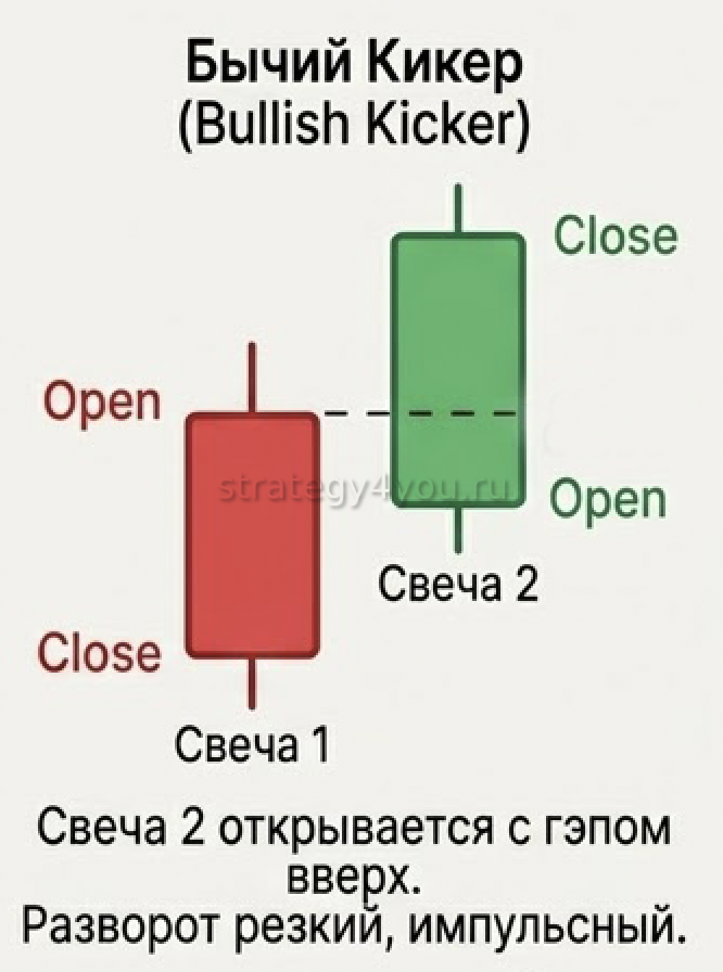 Паттерн Kicker (Кикер) — это двухсвечной разворотный паттерн Price Action, при котором вторая свеча открывается на том же уровне, что и первая, и движется строго в противоположном направлении. Считается одним из сильнейших сигналов смены тренда в свечном анализе.